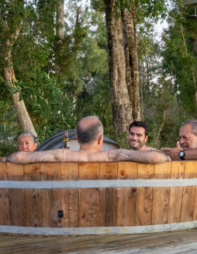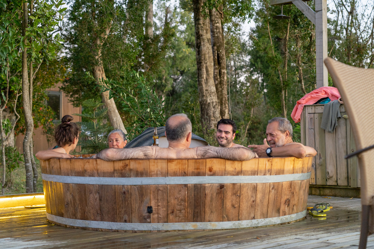 Tina para hasta 8 personas, ubicada en un deck amplio con vista abierta.